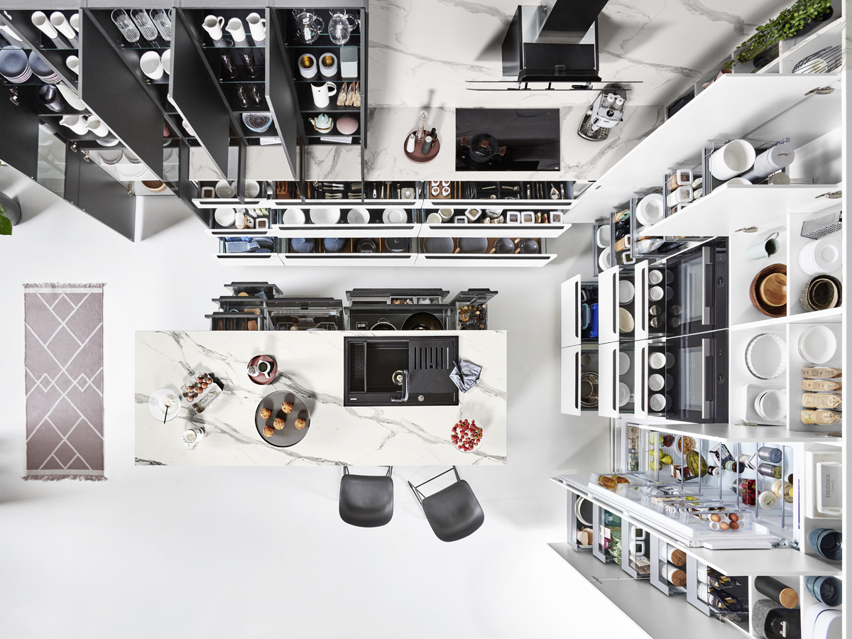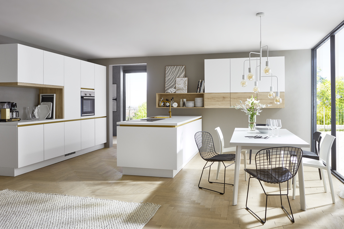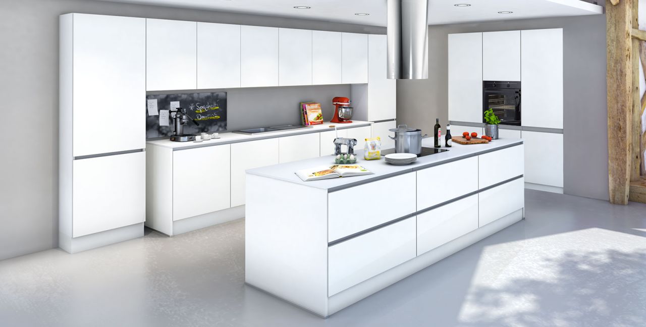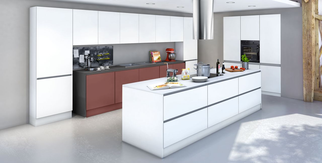 Inclusief inbouwoven zwart Junker JF1300061 Energieklasse A, keramische kookplaat Junker JR36DT54, RVS-eilandschouw Faber CYLINDRA ISOLA IX Energieklasse C, koelkast Junker JC20KCSE0 Energieklasse E, volledig geïntegreerde vaatwasmachine Junker JS55X01ITE Energieklasse E, RVS-inbouwspoelbak Rodi Okio Line 85 Deep, onderkasten met grote laden.